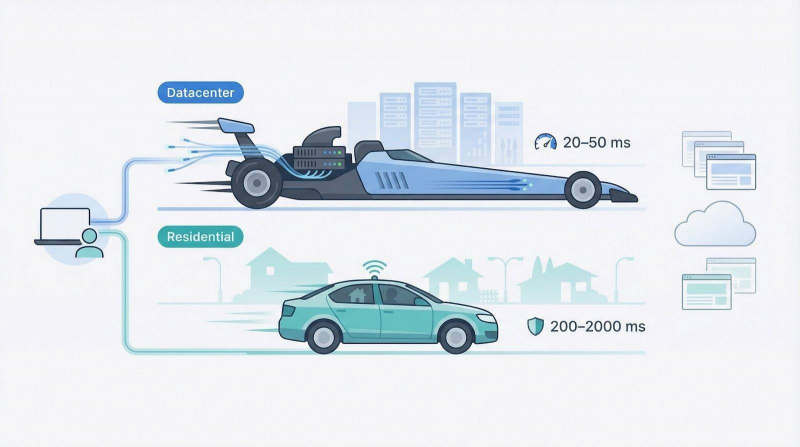 Picture two cars at a stoplight. The dragster—your datacenter proxy—hits top speed in 1–50 ms at 100 Mbps-plus. The family sedan—your residential proxy—cruises at 200–2 000 ms yet slips past anti-bot radar (latency benchmark). If one mask is enough, use a VPN; the minute you juggle dozens of sessions, scrape prices, or chase sneaker drops, you need proxies.