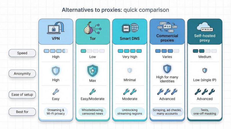 Match the tool to the task: a VPN for blanket privacy, Tor for maximum secrecy, Smart DNS for video, and commercial proxies when you need many identities at once.